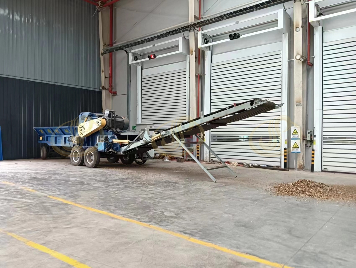 在安徽某大型生物质燃料生产基地,日处理需求超300吨,郑州金鹏35吨大型木材粉碎机作为核心设备持续运转。装载机将原木、模板和秸秆捆送至双链板系统,物料同步进入宽腔体,双转子结构高速剪切,粗料经双出料皮带分流至不同料仓。
