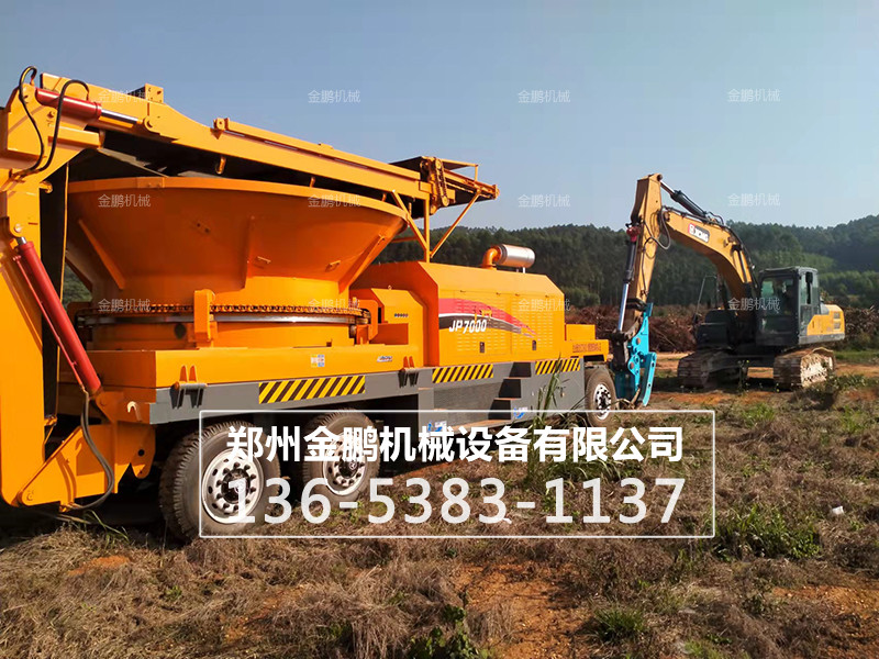 树墩粉碎机工作时,由电机带动转子进行高速旋转,同时进料斗也在电机的带动下进行缓慢的旋转,物料经抓机投放进料斗,料斗在旋转的同时内壁上的拨料齿会将物料均匀的拨到转子上,高速旋转的转子碰到物料经由转子上刀片的切削和撕扯实现物料的初步破碎,进过初步破碎的物料无在自身重力和转子冲击力的作用下掉在破碎腔内的筛网上,符合要求的物料会通过筛网排出,而不符合要求的会在破碎腔内进行二次甚至三次的破碎加工直至符合要求。
